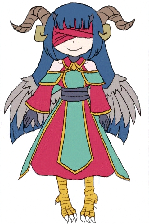目:目隠れ(物) 髪:パッツンロング 体:角+鳥足 服:黒インナー+肩だけ露出+低露出+構造不明ファンタジー衣装