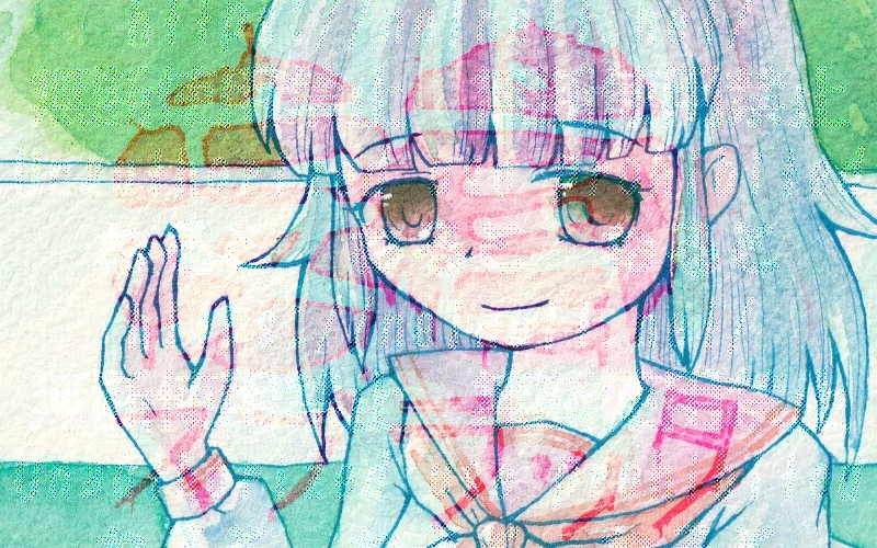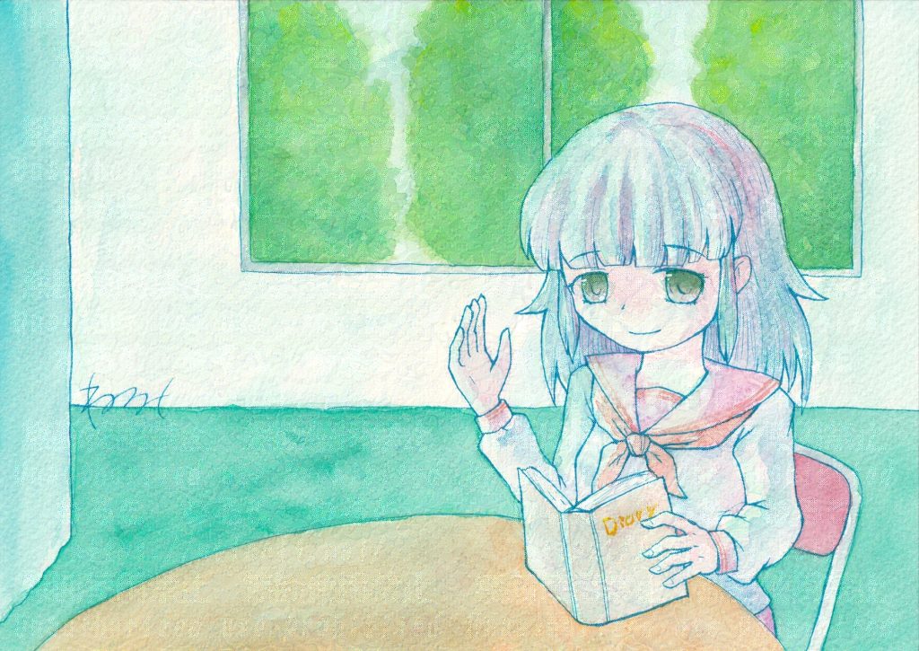 保健室の海月(かいづき)さん イラスト 2025.06.12(木) 保健室の掃除当番になった時に初めましてと名前を言って、いつもいるけど気にしないでねと彼女は続けた。体が弱いのか、他に事情があるのか何も聞けなかったが確かに彼女はいつもいて、保健室に入る度に軽く挨拶をするだけの日々が続いていた。 ふと彼女のいつも読んでいる本に大きく日付けが書いてあるのが目に入った。日記帳のようだ……。 不意に出かけた言葉を飲み込む、「初めまして」と言われたのは最初だけだったじゃないか。 はがきサイズ海月さん